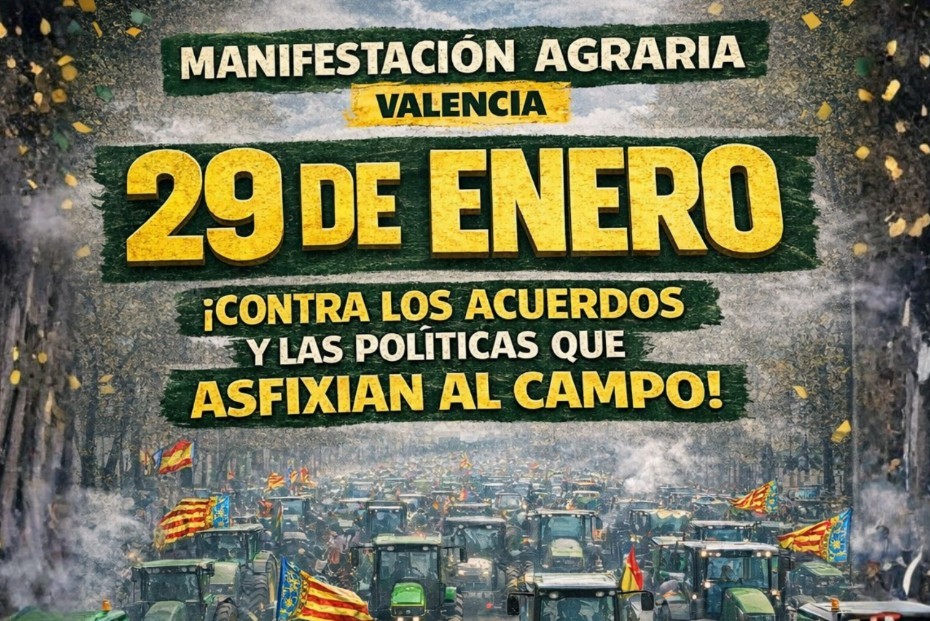 El sector agrario convoca una tractorada y manifestación el 29 de enero en Valencia Las organizaciones profesionales agrarias de la Comunitat Valenciana -la Asociación Valenciana de Agricultores (AVA-ASAJA), LA UNIÓ Llauradora i Ramadera, la Coordinadora Campesina del País Valenciano (CCPV-COAG) y la Unión de Pequeños Agricultores y Ganaderos (UPA-PV)-, con el apoyo de Cooperatives Agro-alimentàries de la Comunitat Valenciana, organizarán una tractorada y manifestación en la ciudad de Valencia el próximo 29 de enero. Esta protesta coincidirá con otras convocadas en toda España a lo largo de la semana que viene, pero que tendrá en el 29 de enero la jornada central: el ‘superjueves’ del campo español.